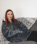 Blanket hoodie with adjustable heat setting – low, medium and high. Super-soft microfleece with large hood and large pockets. Connects to most power banks by USB-A (power bank not included).