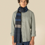 50% cotton/50% viscose. Hand woven twill with fringes.Reversible double-sided fabric: one side in herringbone pattern, the other with contrasting stripes in shades of beige, blue and brown.Tag free,Scarves may vary slightly in colour from one piece to the next, a sign of authentic craftsmanship.